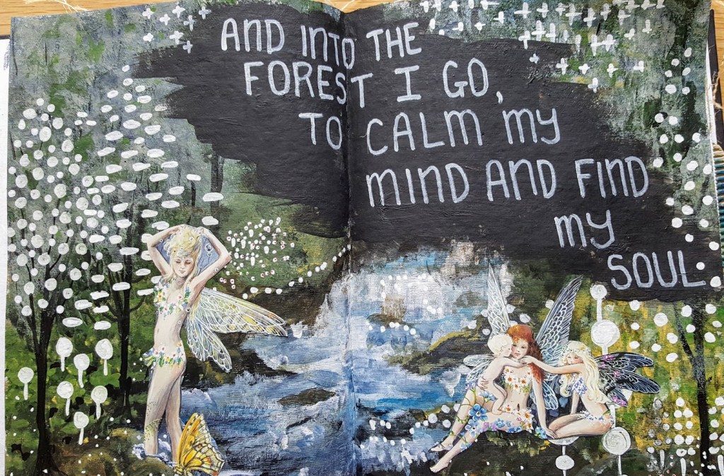 Today, Holly and I did an online painting tutorial with Bob Ross. So, in about an hour we both created a babbling brook landscape – she used oils and I used acrylics. It was fun and while they may not go into an art gallery it was a nice activity to do together. I had a few difficulties with definition, proportion, depth, highlights – well lots of things, but I have since added some doodling and collaged a couple of fairies into it and turned it into something happy for my journal. Sometimes, it is hard to know when to stop and I added black gesso for a quote, which I then ‘misquoted’ . The quote was meant to be “And into the forest I go, to lose my mind and find my soul” by John Muir, but I replaced lose with calm. I don’t really want to literally ‘lose’ my mind, so this sits better with me anyway. Plus, even though it’s not perfect, its about ‘the process’ of creating, so I’m happy.
