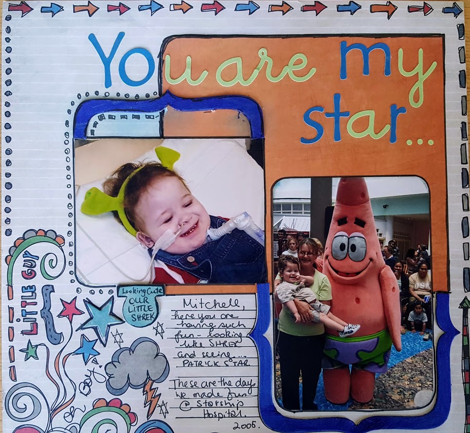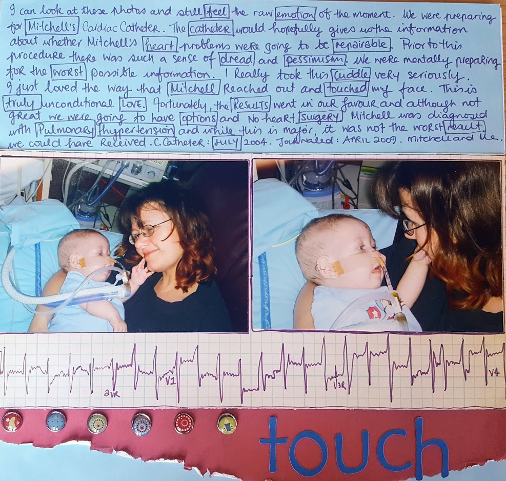 Yesterday and today, I have been working on creating a medical timeline of Mitchell’s life using a tool I found on wordpress. The process is arduous and although I have attempted making timelines multiple times, I have always given up under the enormity of the job. There are thousands of photos that proffer up memory triggers and I am trying to match the photos to my diary, blog and facebook notes. Since 2003, I have moved from storing photos on negatives, to CD-rom, to SD cards and memory sticks, to online storage like Picasa, and now I use google photos. During that time we have had multiple desktop computers, cameras, phones and laptops, and while I have been diligent with my memory keeping in the form of scrapbooks, I am now trying to gather all my material together to tell a complete story. It’s a huge job. Having lost photos that were not in duplicate when Mitchell was still in hospital, I have also been taking photos of the layouts I have made about his story (and our family stories), just in case, our photos albums are ever lost or damaged. I am grateful for the pages I have created, like this one, which take me back to a moment in an instant.