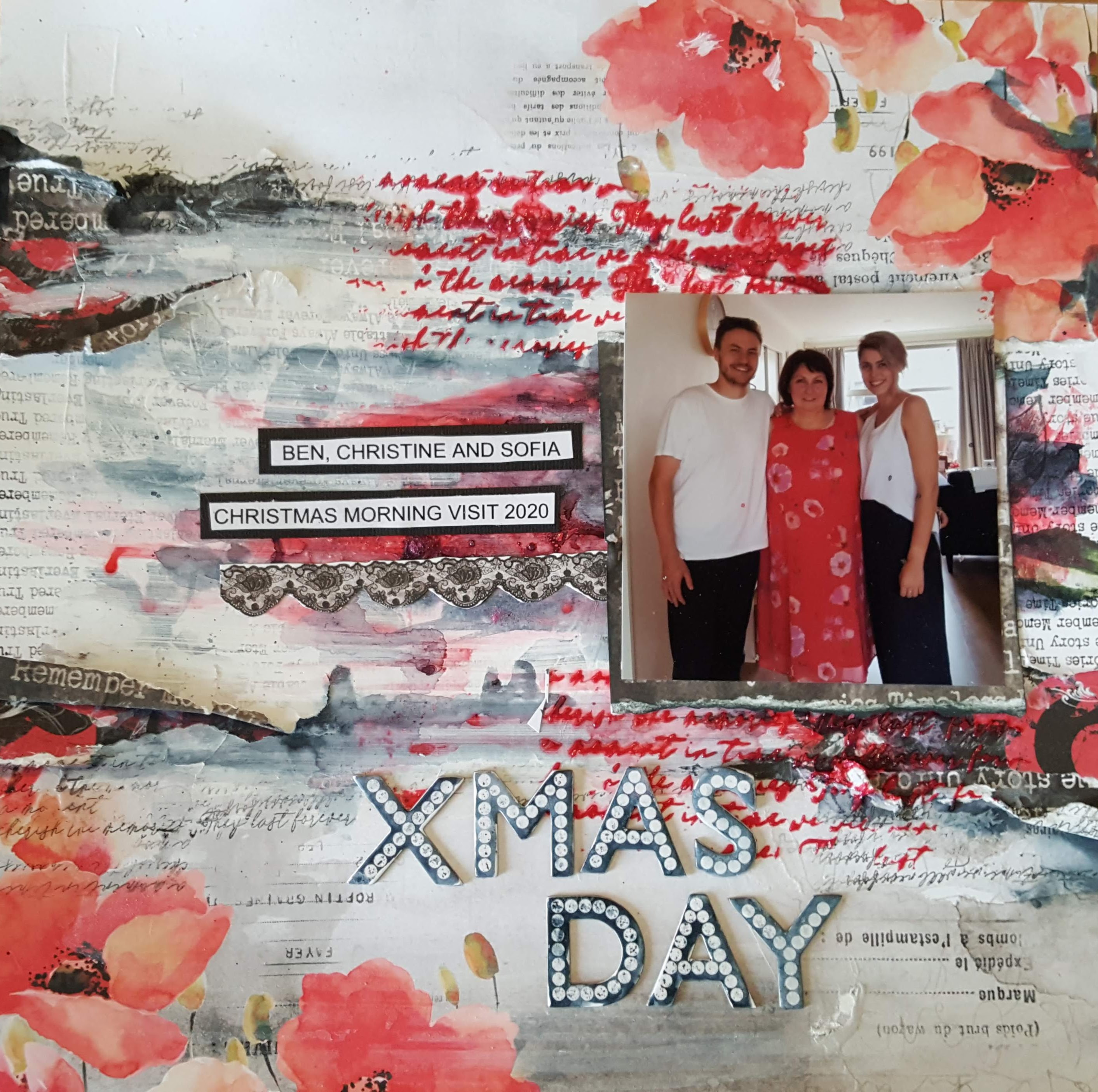 We then did a class by Aida, who comes from Poland. The two pages featured small black and white photos of her as a child (about 3 x 4″), plus a lot of dimensional work. Again, I chose to recreate my layouts to suit different sized photos, and also decided to leave some of the dimensional elements off the page as I wanted to put mine in an album, rather than in a frame. As the pages had red, black and white tones, I went with photos in these colourways.