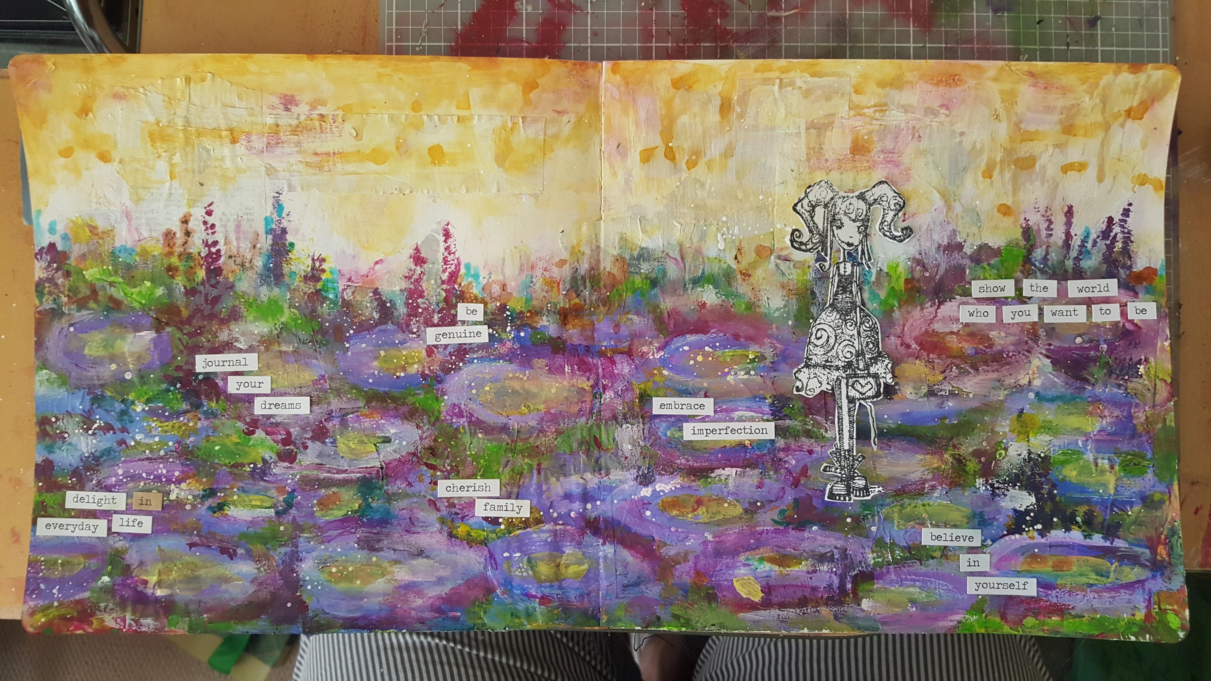 Week 2 – was a class with Laly Mille. In 2019, her lesson was one of my favourites. This year, it was to do a garden of wishes – there is collage, paint and pastels in there. I don’t mind the end result, but my natural style is far removed from Laly’s beautiful calm, pastel and soft colour palettes. I worked in a brighter colour palette and ended up with a golden sky – but I guess I made it my own. I decided to add the little stamped girl in the garden, to symbolise how we don’t always fit in to our environment.