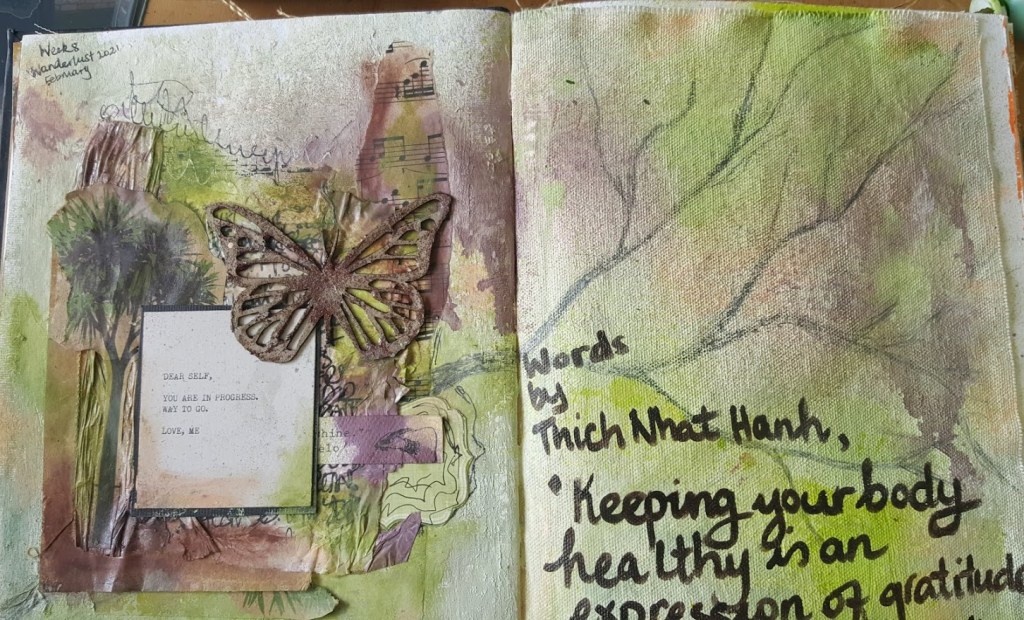 Week 7 with Kate Crane was a fun page using Ephemera, and I decided to do this one in my gratitude journal. Week 8 was a page inspired by nature and using a collection of Ephemera with Renee Mueller. I struggled with this one and did not like the way my quote looks on the page as the writing feels too messy – but it is what it is – a learning experience and I tried out my sprays on the canvas page, and used up some bits and pieces that had been sititng around looking for a home.