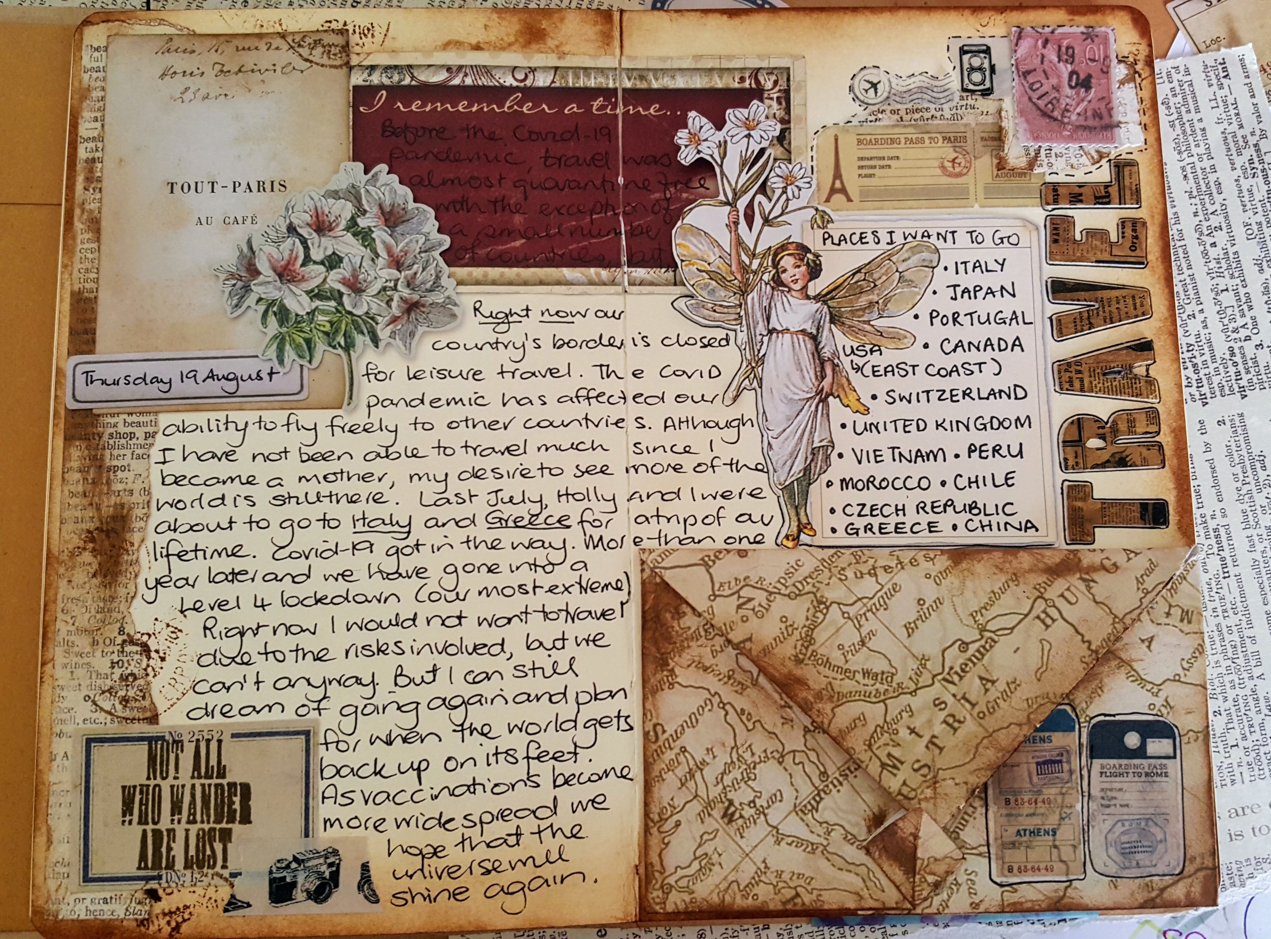 I had recently purchased an extra dylusions journal (approx 8″ x 5″) at the SENZ show last month, so did this spread in there. I’m not exactly sure what the journal will be about, but I decided as the page was about ‘hopes and dreams’ it didn’t really fit in my other more mixed media journals, and I didn’t want to work in my 8 x 8 self care journal. So, I just had to start yet another journal. This is the size I also use for my gratitude journal and I like this size for pages which I am doing handwritten journaling on and where and when you are not necessarily doing layered or dimensional work. Helen did add some texture paste to her layout (it was after all a texture class), but for this purpose I wanted to keep my page relatively flat, so the ideas I used were to use the distress ink edges, making a little origami envelope and a little bit of stamping and washi tape. Inside the envelope I have a couple of little cards, one is a little more journaling , the other a picture of Milan, Italy. I just think this journal might have to become a place to house my thoughts on goals, plans, habits and the like. But you know I might change my mind by tomorrow.