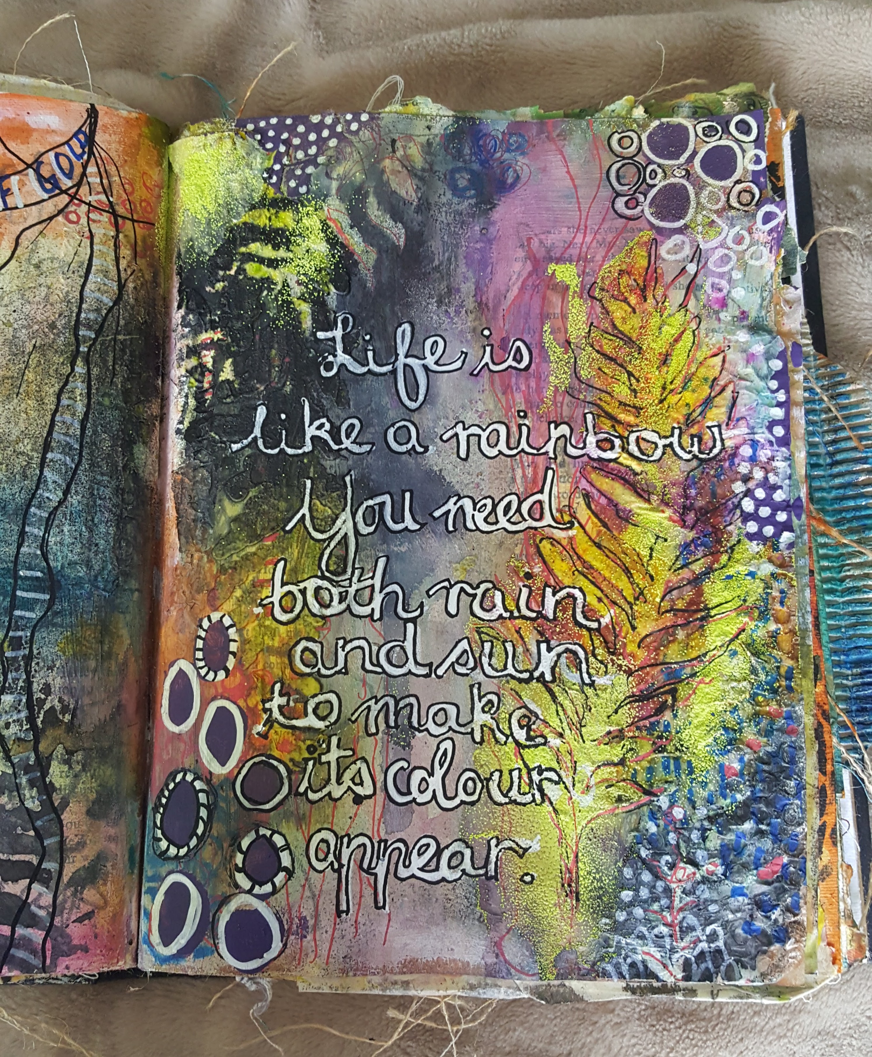 I completed one more spread for the Wanderlust 2021 class. The topic this time was rainbow, and the class tutor was Tania Ahmed. Her creation was a double page using gloss sprays, hidden journaling and gel medium with embossing. I used all these techniques, but as always it looks nothing like her original. But that is what I like about Wanderlust, it is a class that gives you freedom to pick what you want to do.