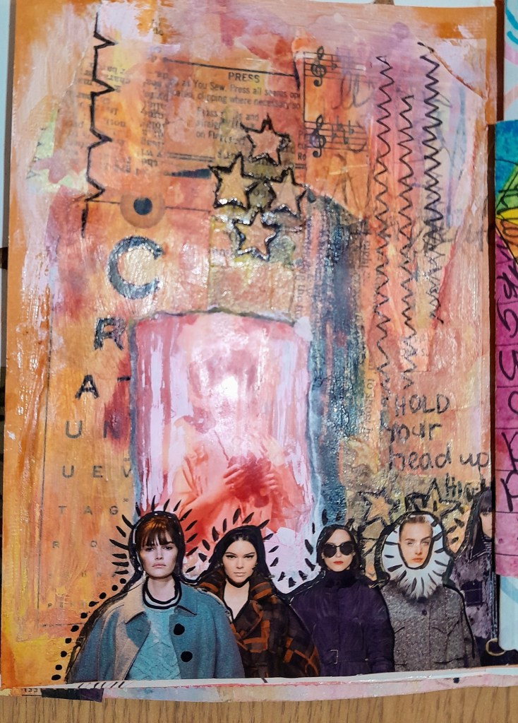 Not sure what is happening with my style of late, but I am feeling more comfortable just splashing a bit of paint, making marks, and sticking down random images. Not making a lot of sense, but for some reason it makes me happy.