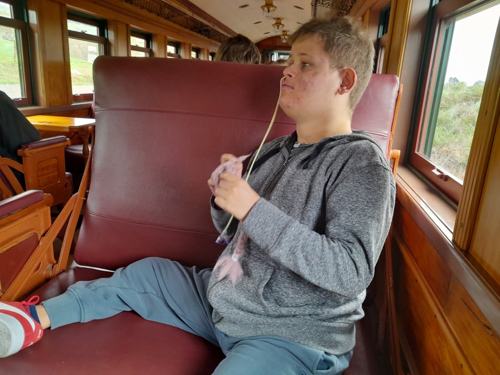 Saturday afternoon (once we could raise Mitch) we went on the vintage train that operates between Waihi and Waikino – known as the Goldfields Railway. I have done this previously with Mitch and Holly when they were young, but Mitchell still seemed excited about the train ride. The train ride is about 30 minutes each way, and passes through countryside and by the Gorge. Mitchell is most excited when he is feeling the fresh air and wind in this face, as you can see in the first pic. The interior of the train is original style in one cab and been modernised in the other.
