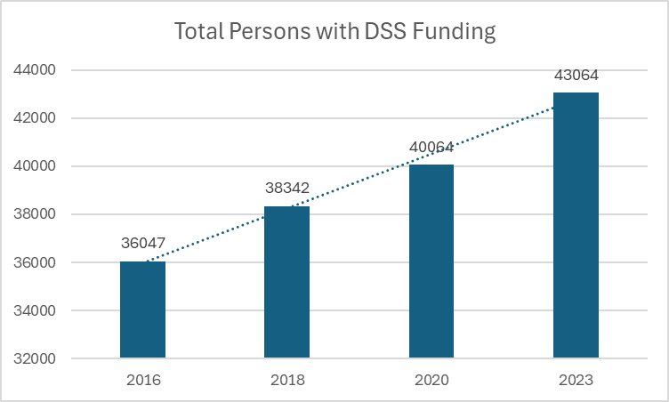 In recent news, it has been quoted that in the past year, the number of people supported via DSS increased by 3,000 – I don’t have access to the origin of the statistic, but I can share what growth has looked like from 2016 to 2023 in the graph below.
